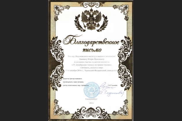 С 4 по 6 декабря в Екатеринбурге состоялись IV Декабрьские чтения по правам человека «Личность, социум и мир», в которых приняли участие студентки 5 курса группы СКСТ-101 Пивоварова Юлия и Шушкова Оксана. Чтения проходили на базе Уральского федерального университета имени первого Президента России Б. И. Ельцина, который входит в Топ-500 университетов мира.