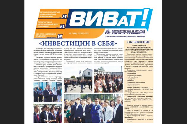 Вышел первый в этом учебном году номер газеты «ВИВаТ!». В этом выпуске мы рассказываем не только о жизни вуза в первый осенний месяц, но и о значимых событиях, которые произошли в институте за период летних каникул: поздравление преподавателей с Днем учителя, старт конкурса "Цифровой мир", начало занятий в детской компьютерной школе, хроника событий международного образовательного центра ВИВТ, традиционная встреча выпускников ВИВТ, итоги конкурсов в социальных сетях, знакомство с новыми лицами КОМАНДЫ ПРОФЕССИОНАЛОВ (интервью с Анастасией Жавлиевой) и, конечно же, самый яркий момент в студенческой жизни первокурсников - Посвящение в студенты.