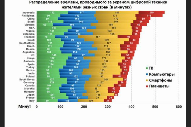 Российские граждане проводят перед экранами телевизоров и компьютеров в среднем около 7 часов в день Жители России оказались в середине списка «гаджетозависимых» стран: в среднем 98 минут в день уходит на просмотр телепередач, около 158 минут тратится на работу за компьютером, а по 98 и 66 минут наши соотечественники проводят за изучением информации с экранов смартфонов и планшетов. В общей сложности россияне проводят перед экранами электронных устройств 420 минут (7 часов). Меньше всего времени посвящают электронным устройствам жители Италии: из 317 минут (5 часов 17 минут) 89 минут они отводят на телевизор, 85 минут на компьютер и 109 минут на смартфон. А вот планшеты в этой стране не так популярны - всего 34 минуты в среднем жители Италии проводят за этими устройствами.